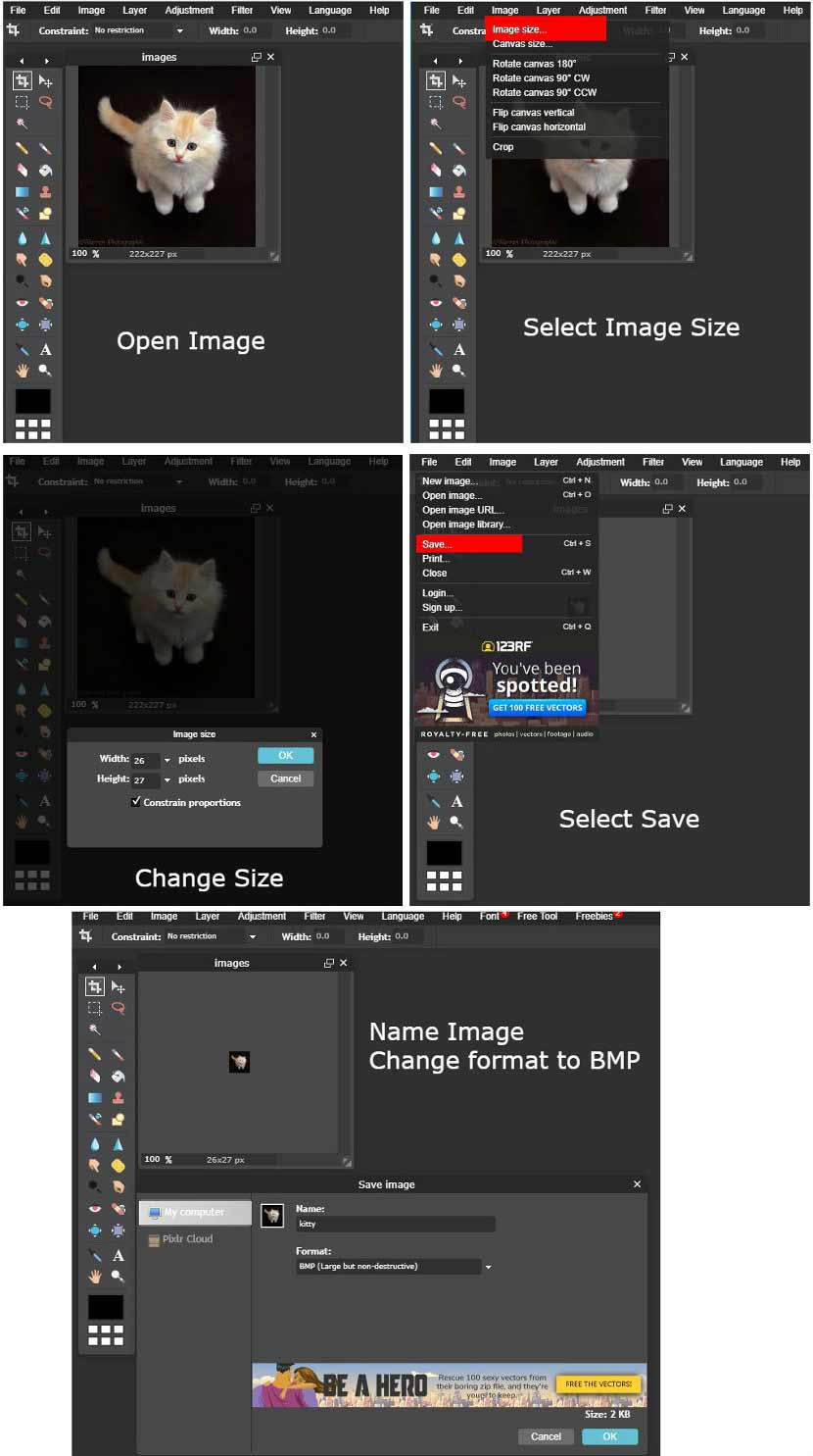 Patterns must be saved as bitmap (.bmp) files to be able to be displayed on the hoop. There are several tools you can use to save an image file as a bitmap file. This help doc covers how to do it with Pixlr.