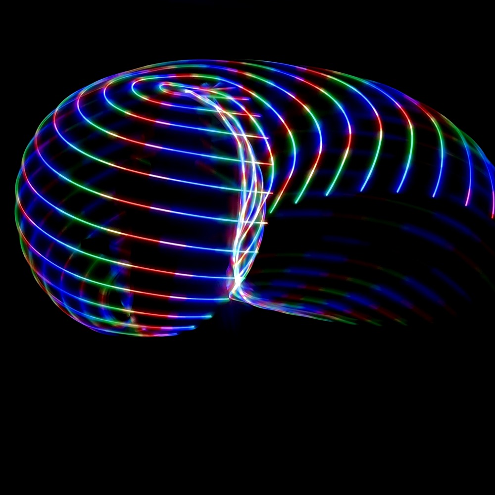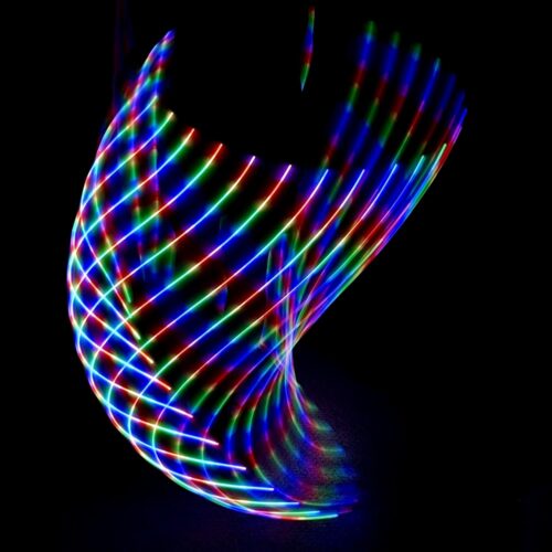 Vibrant LEDs are blocked into a red, orange, yellow, green, blue, purple pattern for the ever-loved Rainbow hoop! These specialty single-color LEDs look solid when still, but burst into single-color dots when in motion, giving this hoop fabulous battery life and creating rich, vivid trails.