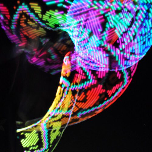 - Galaxy (blinks white) – This meditative rippling rainbow stasis mode gives your eyes a rest and allows for more flow focused dancing. The gentle color shifting rainbow uses low power and is great for chill spaces and conserving power while walking around.