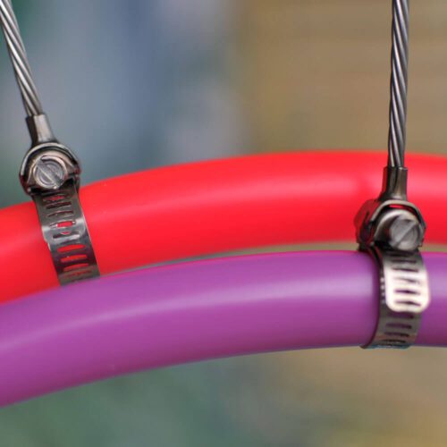 - Hoop can be opened and partially coiled down for travel.
