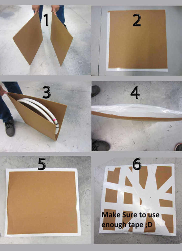 If you no longer have the box the hoop came in you can use two large, flat pieces of cardboard, approx 20″ x 20″ x 2”, and tape around the edges with the hoop inside.
