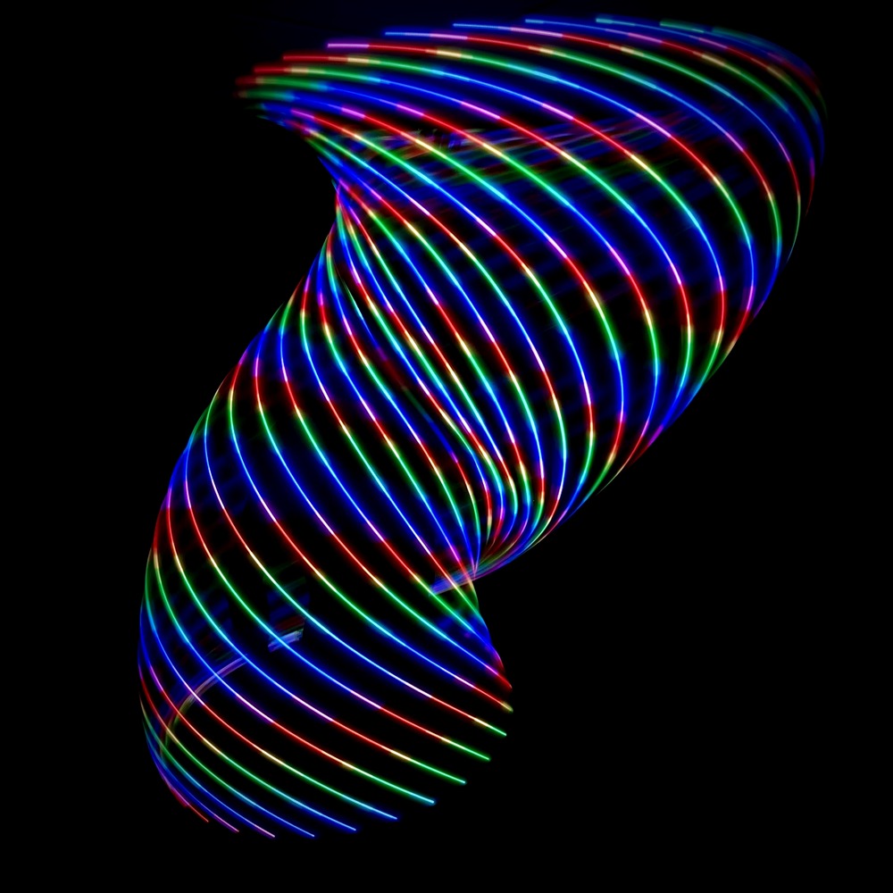 Vibrant LEDs are blocked into a red, orange, yellow, green, blue, purple pattern for the ever-loved Rainbow hoop! These specialty single-color LEDs look solid when still, but burst into single-color dots when in motion, giving this hoop fabulous battery life and creating rich, vivid trails.
