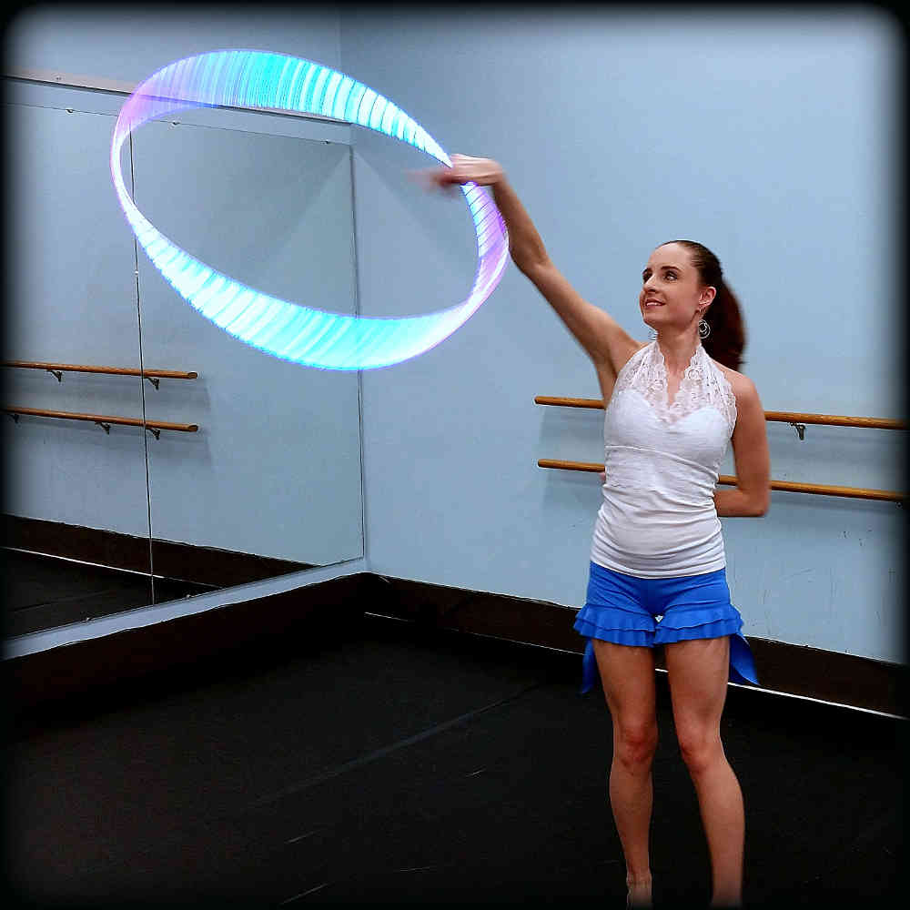 I like practicing at home if I can find the space because I have everything I need at home. I very much enjoy my new space at the YMCA where I teach hoop dance classes in Jamestown NY. I also love going anywhere warm with high ceilings and lots of space. I also enjoy hoop dancing outside on a beautiful day with soft and even grass or on even concrete.