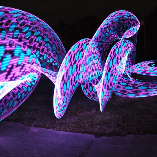 - Galaxy (blinks white) – This meditative rippling rainbow stasis mode gives your eyes a rest and allows for more flow focused dancing. The gentle color shifting rainbow uses low power and is great for chill spaces and conserving power while walking around.
