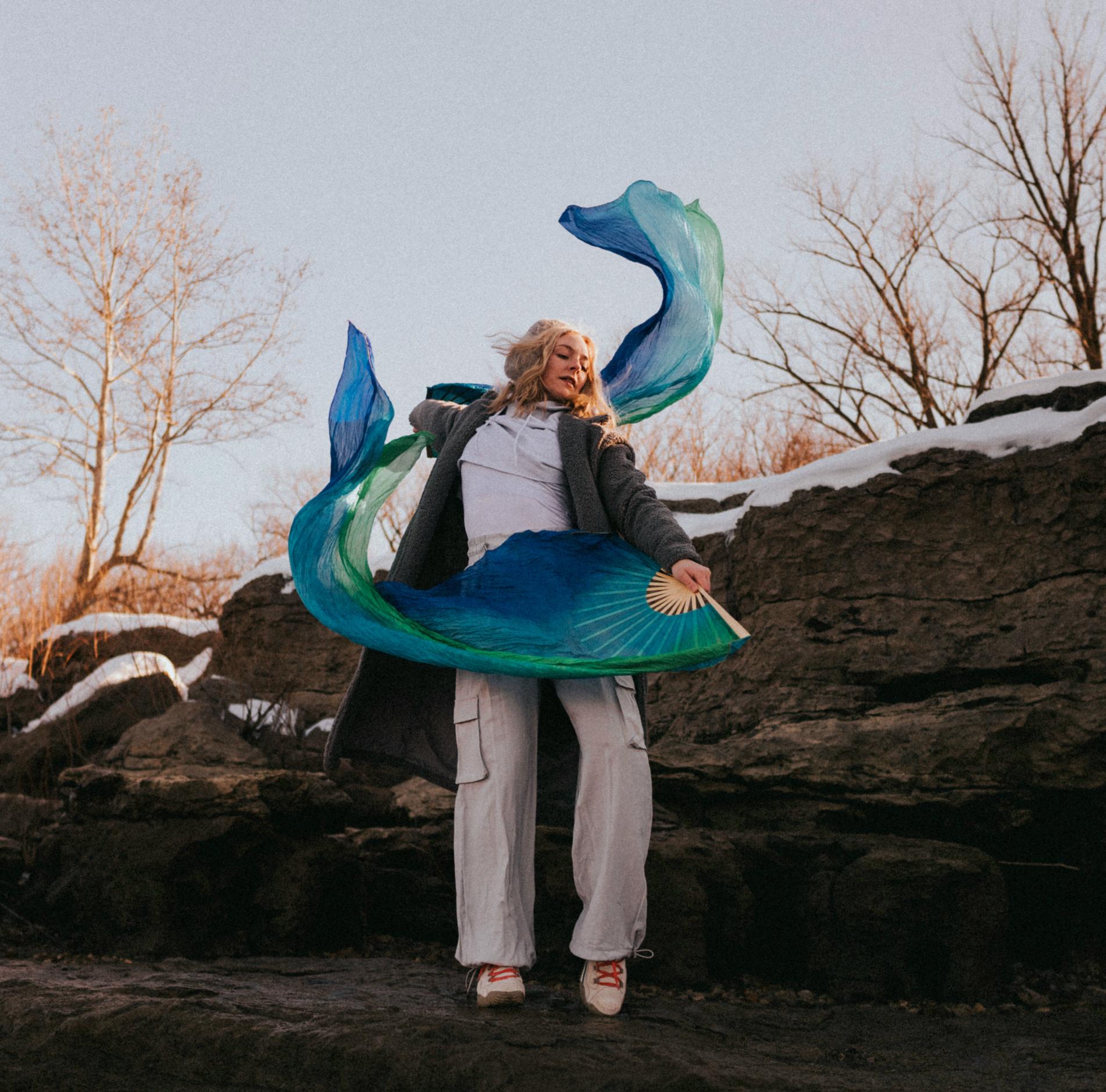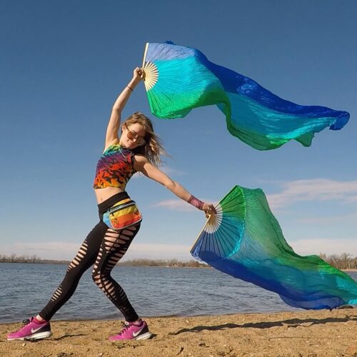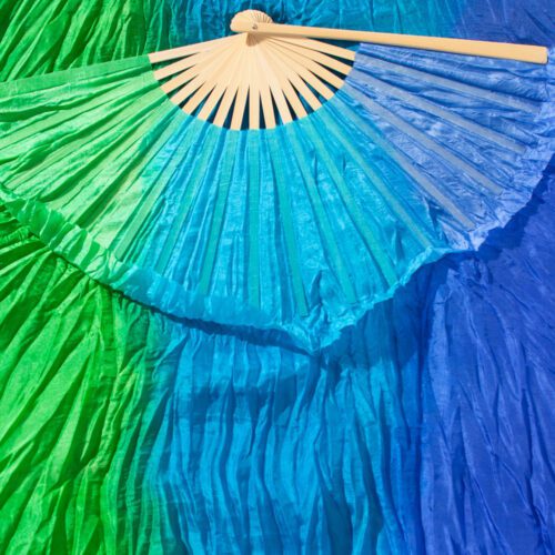 Each silk fan is hand-dyed which may create slight fluctuations or spots in the color that are unique to the individual fan. The wood used for the fan frame may also have slight fluctuations in the color, which is a natural part of the material.